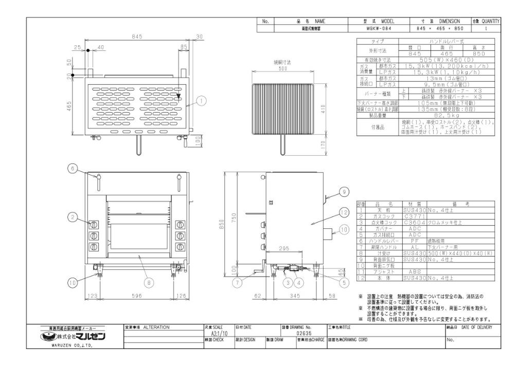 ●外径寸法:幅845×奥行465×高さ850(mm) ●庫内寸法:幅505×奥行460 ●ガス消費量:都市ガス:15.3kW(13,200kcal/h)、LPガス:15.3kW(1.35kg/h) ●ガス接続口:都市ガス:ゴム管口13mm、L3(4A、4B、4C)、L2(5A、5AN、5B)、5Cの場合は15A、LPガス:ゴム管口9.5mm ●下火バーナー高さ調節:無段階昇降ハンドル方式 ●重量:82.5kg ●付属品:汁受1、焼網1、串受ロストル2、点火棒1 |
