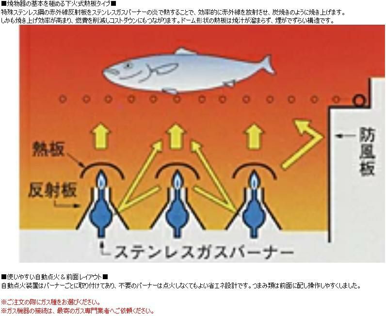 特殊ステンレス鋼の赤外線反射板をステンレスガスバーナーの炎で熱することで、効率的に赤外線を放射させ、炭焼きのように焼き上げます。