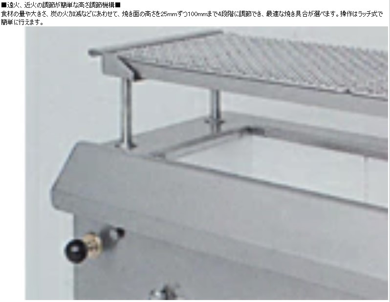 食材の量や大きさ、炭の火加減などにあわせて、焼き面の高さを25mmずつ100mmまで4段階に調節でき、最適な焼き具合が選べます。操作はラッチ式で簡単に行えます。