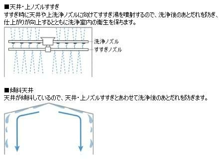 すすぎ時に天井や上洗浄ノズルに向けてすすぎ湯を噴射するので、洗浄後のあとだれを防ぎ、