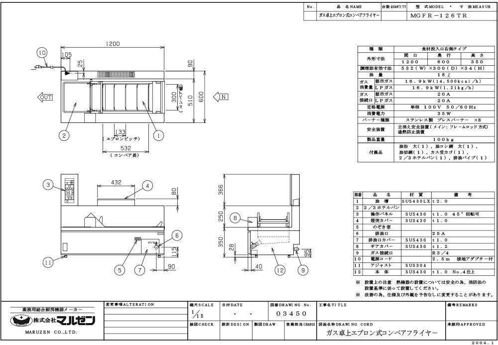 MGFR-126TR(L) 【マルゼン】 ガス卓上エプロン式コンベアフライヤー 18リットル マイコン搭載 幅1200×奥行600×高さ350