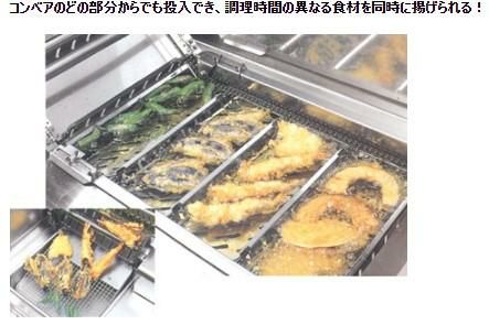 コンベアのどの部分からでも投入でき、調理時間の異なる食材を同時に揚げられる!