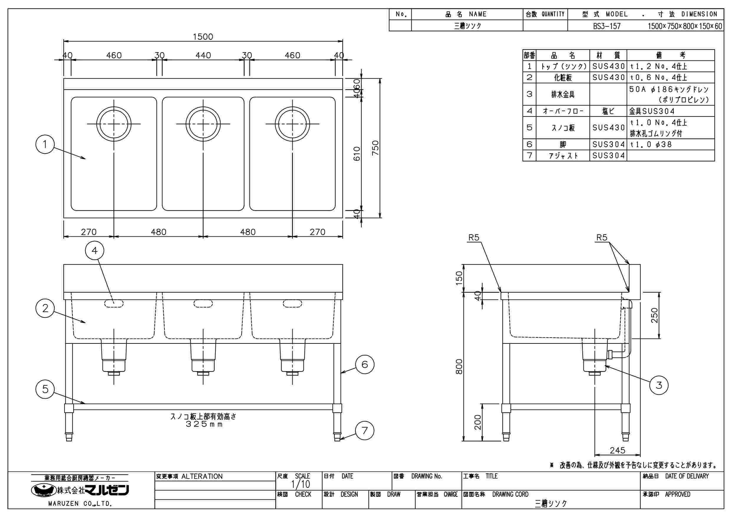 マルゼン 三槽シンク サイズ一覧表