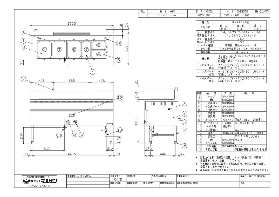 商品名:ガスウォーマーテーブル W1500×D600 角型1/2×3+1/3×1+1/4×2