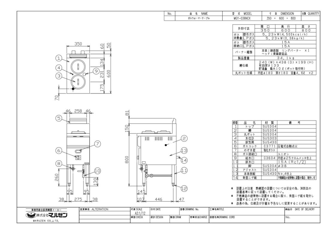 【マルゼン】ガスウォーマーテーブル MGY-036NCX 幅350×奥行600×高さ800mm