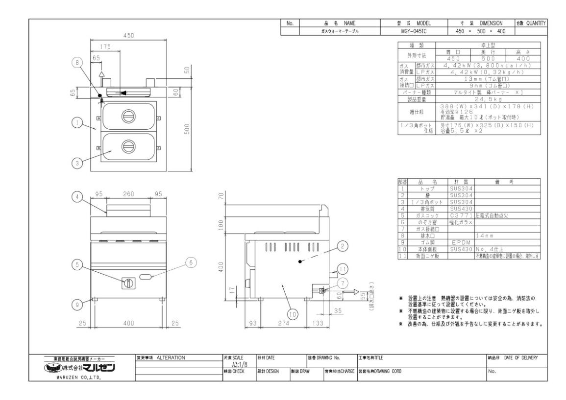 【マルゼン】ガスウォーマーテーブル 卓上型 MGY-045TC 幅450×奥行500×高さ400mm