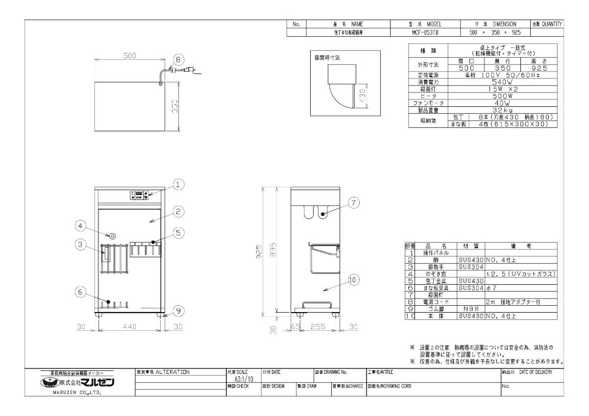 【マルゼン】包丁まな板殺菌庫 卓上タイプ MCF-053TB 幅500×奥行350×高さ925mm