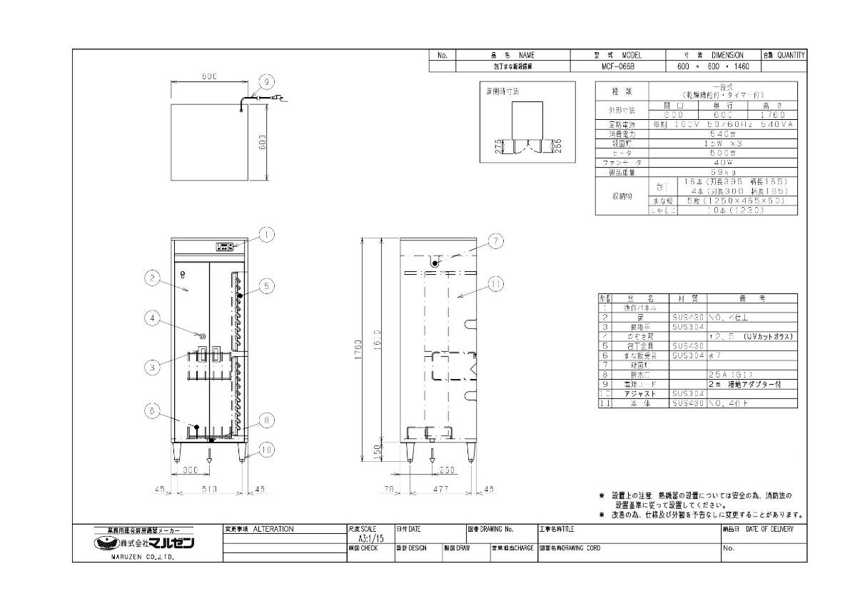 | 商品名 | 包丁まな板殺菌庫 乾燥機能付 タイマー付 包丁20本 まな板5枚 | | 型番 | MCF-066 | | メーカー | マルゼン | | 外形寸法 | W600×D600×H1650(mm) |