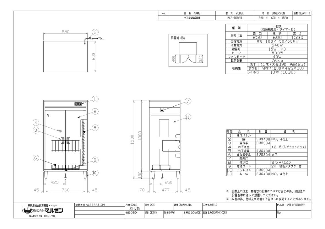 | 商品名 | 包丁まな板殺菌庫 乾燥機能付 タイマー付 包丁15本 まな板8枚 | | 型番 | MCF-B086 | | メーカー | マルゼン | | 外形寸法 | W850×D600×H1420(mm) |