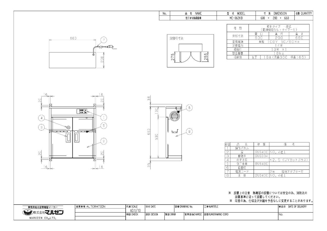 【マルゼン】包丁まな板殺菌庫 MC-062KB 幅600×奥行200×高さ780mm