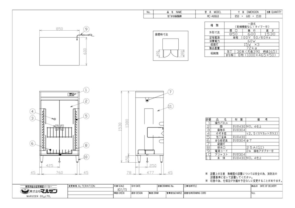 | 商品名 | 包丁まな板殺菌庫 乾燥機能なし タイマー付 包丁30本 まな板8枚 | | 型番 | MC-A086 | | メーカー | マルゼン | | 外形寸法 | W850×D600×H1420(mm) |