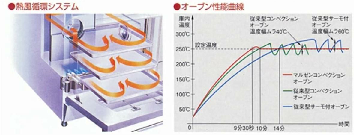 ■クイック提供、大量調理に応える熱風循環システム■ オーブン庫内に熱風を急速に循環させるので、設定温度への立ち上がりが早く、 また食材の表面温度を一気に上昇させるので、調理時間を大幅に短縮。ピーク時も余裕で提供できます。 大量調理に貢献します。