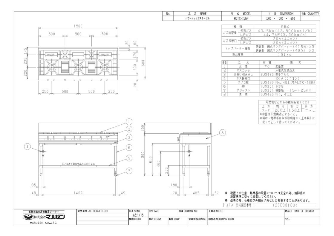 | 商品名 | ガステーブル 5口 W1500×D600×H800 | | 型番 | MGTX-156F(旧型式:MGTX-156E) | | メーカー | マルゼン | | 外形寸法 | W1500×D600×H800(mm) バックガード高さ200mm |