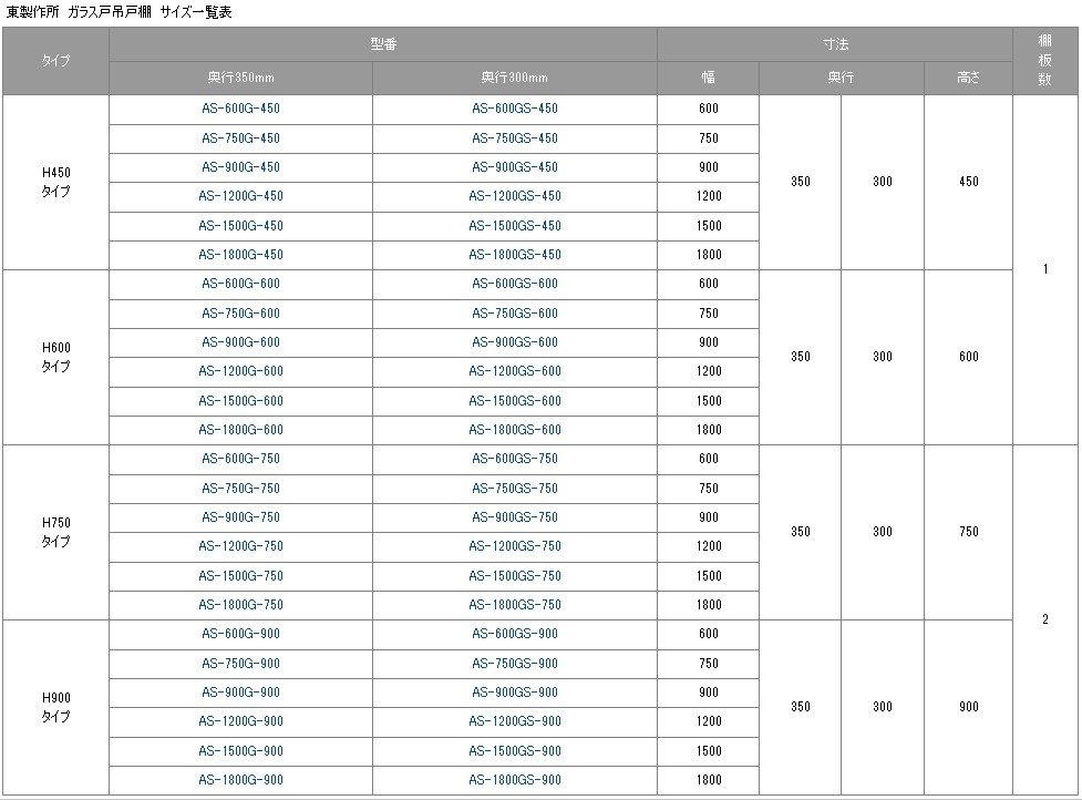 【東製作所】吊戸棚 ガラス戸 AS-900G-600 幅900×奥行350×高さ600mm