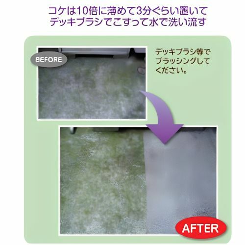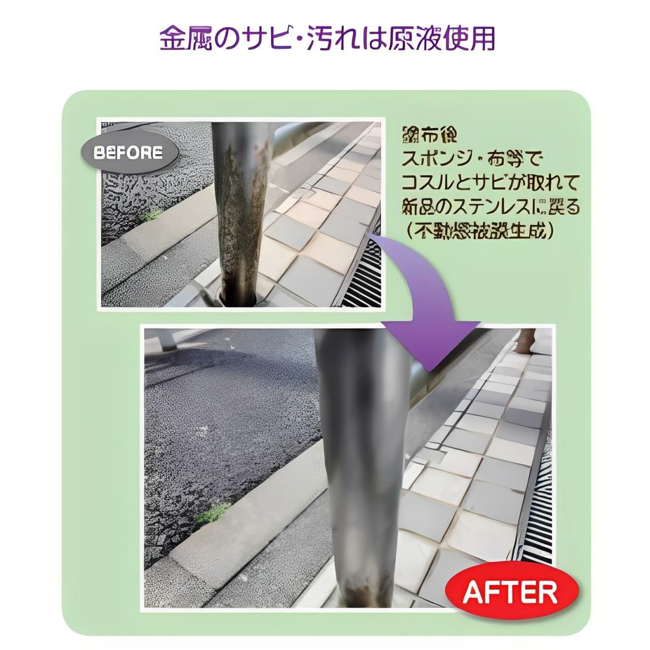 ●酸性の力で水回りの汚れとして石鹸カス・黒ずみ・カルキ・緑青・水垢などの他、尿石やコケの除去にも効果を発揮。