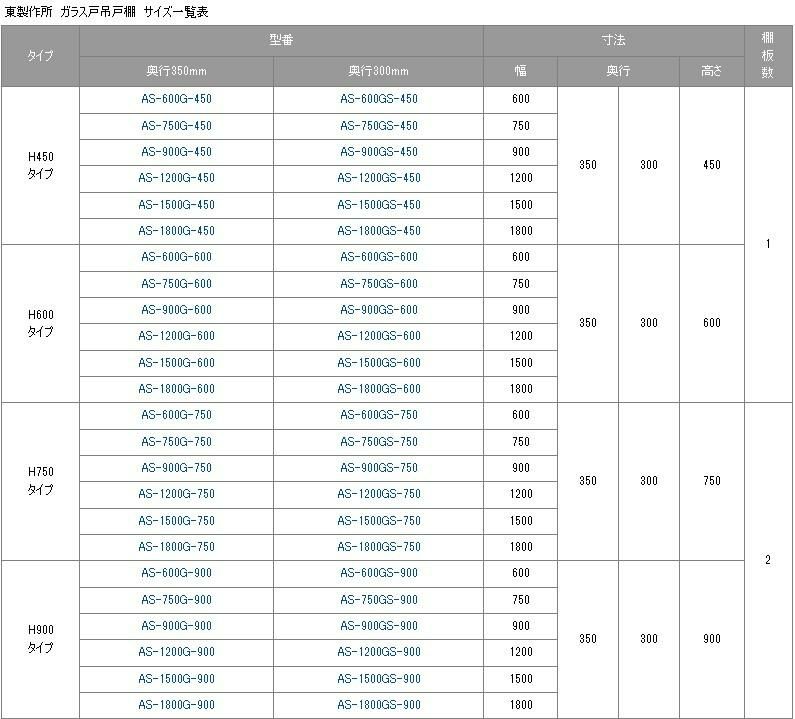 【東製作所】吊戸棚 ガラス戸 AS-600GS-450 幅600×奥行300×高さ450mm