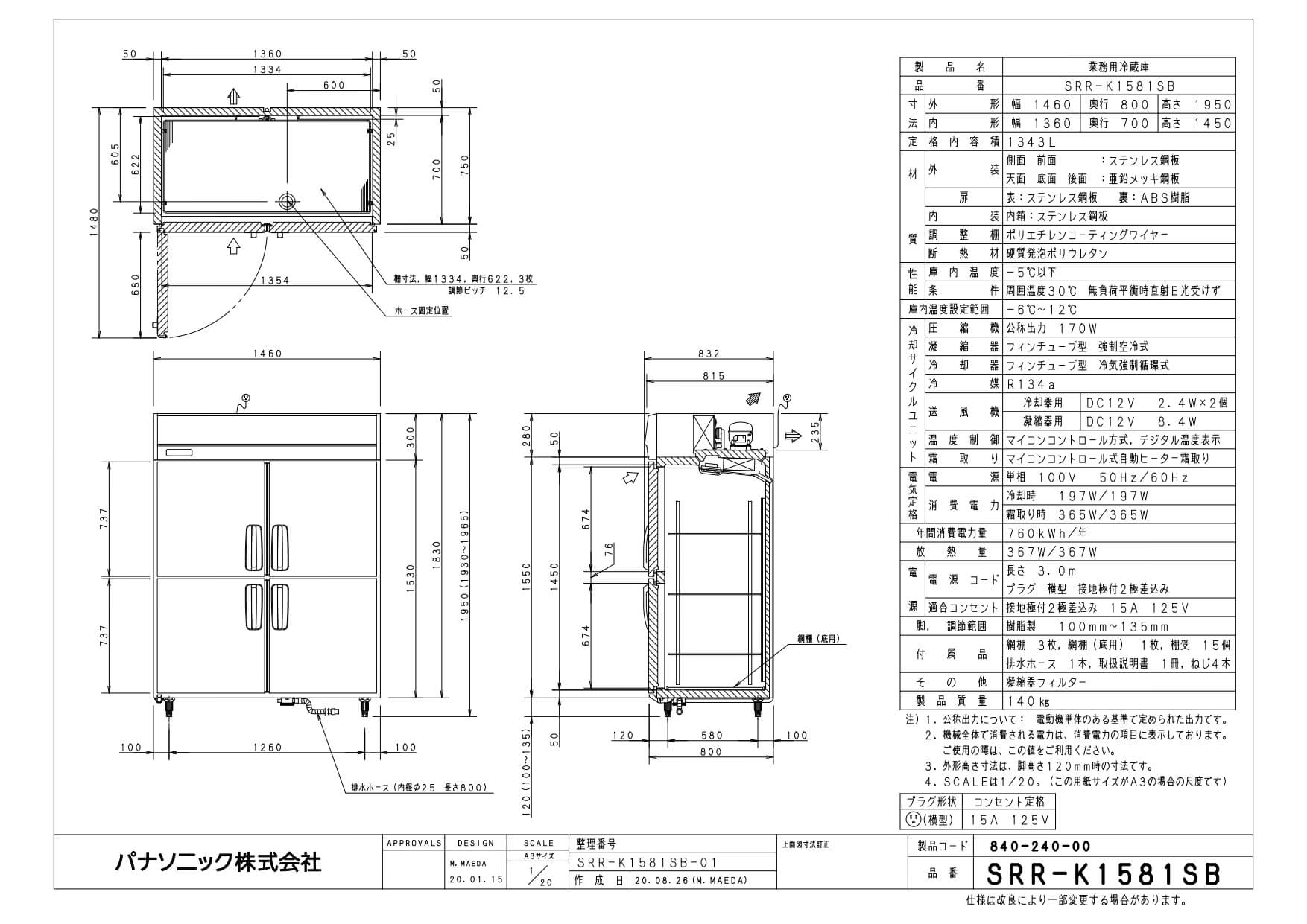 【パナソニック】縦型冷蔵庫 センターピラーレス SRR-K1581SB 幅1460×奥行800×高さ1950mm 単相100V