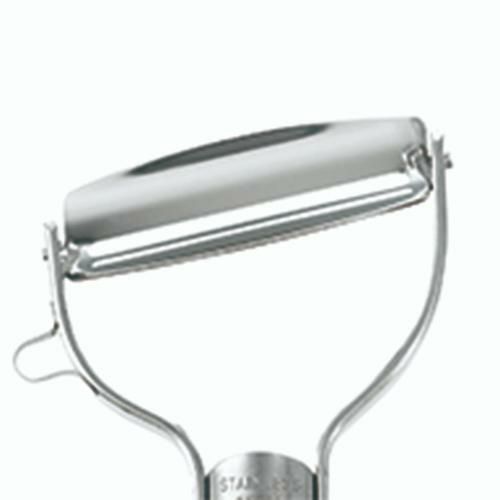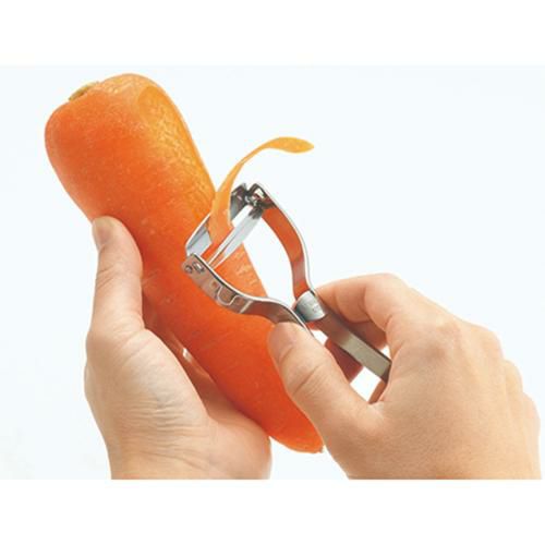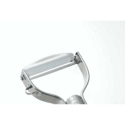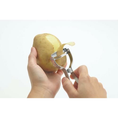 鋭角な刃先の斜め刃で軽い力で皮がむける。刃の上部にかえしがついているのでむいたや野菜の皮がはなれやすい。