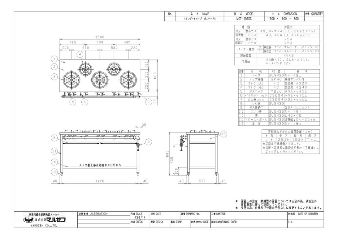 【マルゼン】ガステーブル 5口 スタンダードタイプ MGT-156DS