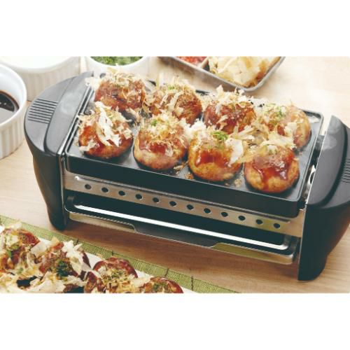 プレート2種類とアミがセットになって、焼き鳥・焼き肉・たこ焼き等の調理ができます。卓上で調理しながらあつあつを楽しめます。プレートは着脱式でお手入れ簡単!