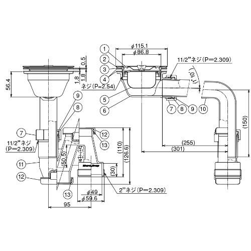 仕様1:サイズ(排水口部):Φ115×H56.4mm