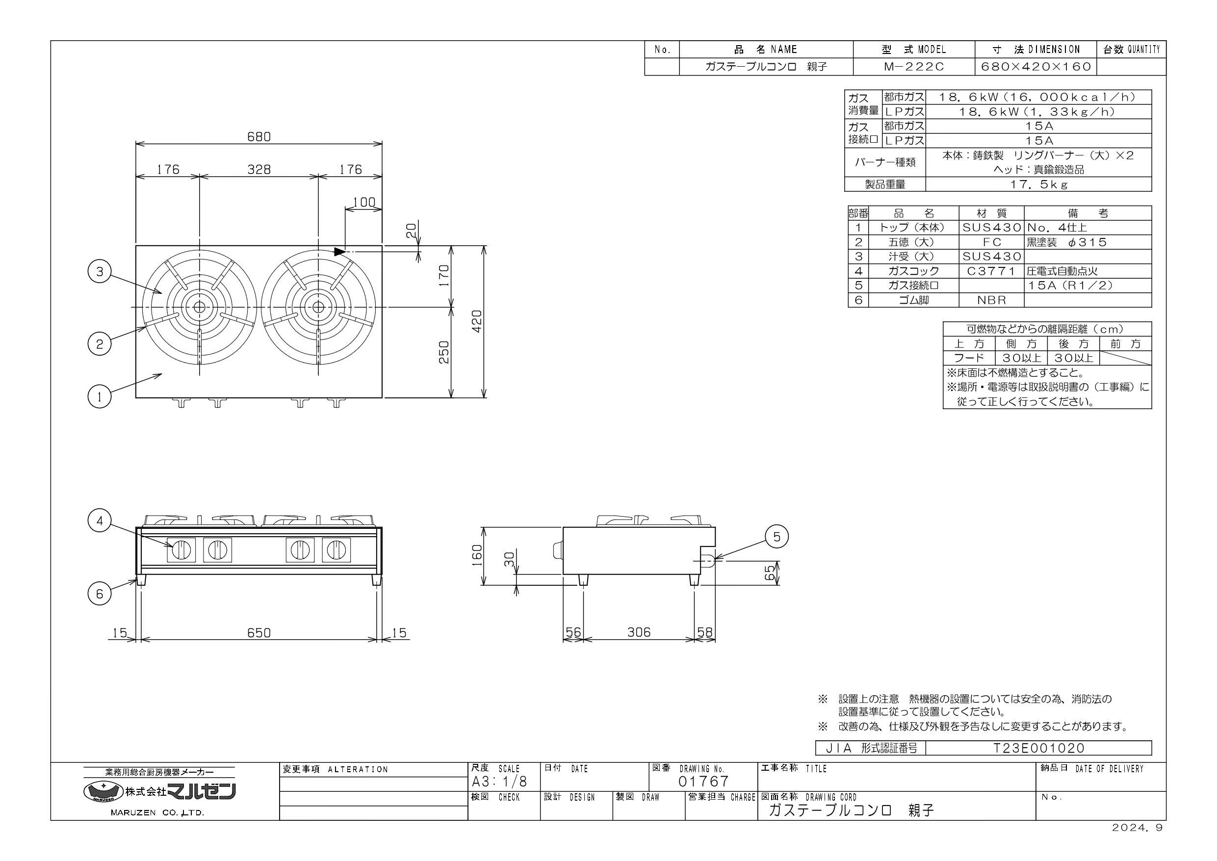 ガス消費量:都市ガス 18.6kW(16,000kcal/h)、LPガス 18.6kW(1.33kg/h)