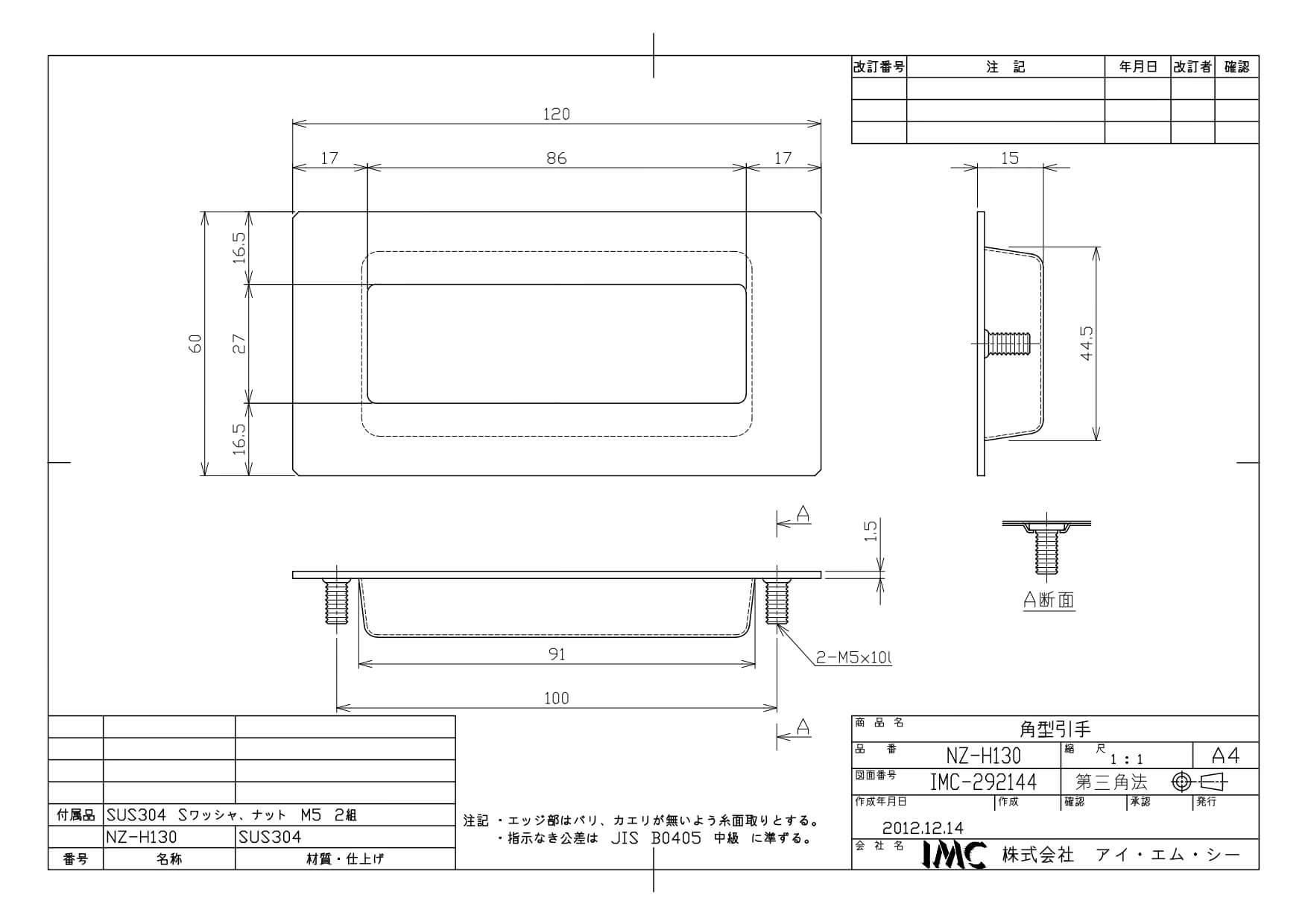 商品名:NZ-H130 304 角型引手 ステンボルト・ナット付