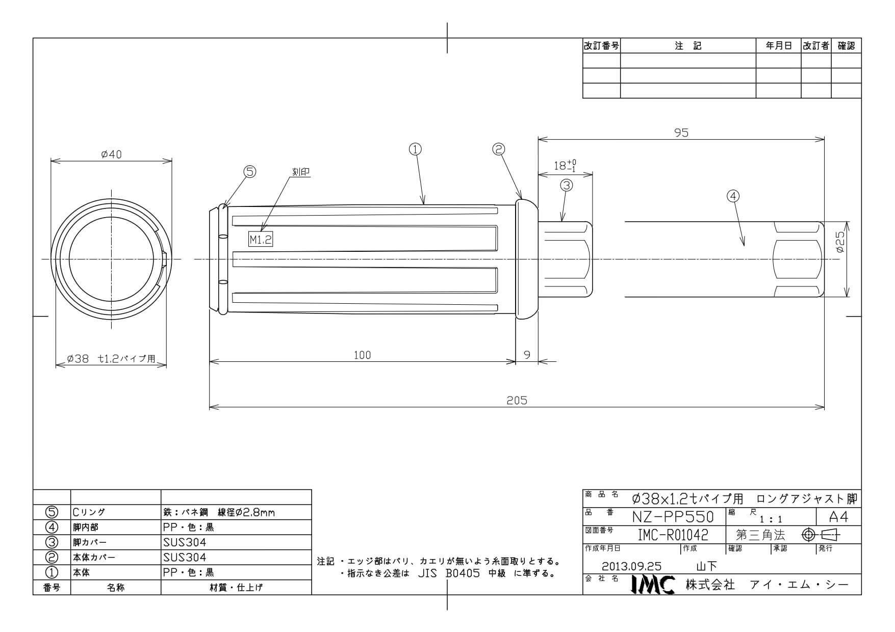 商品名:NZ-PP550 38φパイプ用ロングアジャスト脚 PP製1.2t用