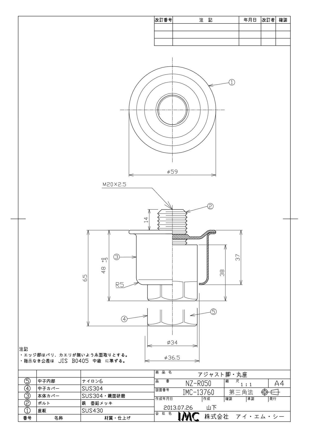 商品名:NZ-R050 新型丸座キャビネット脚 50mm M20ネジ込