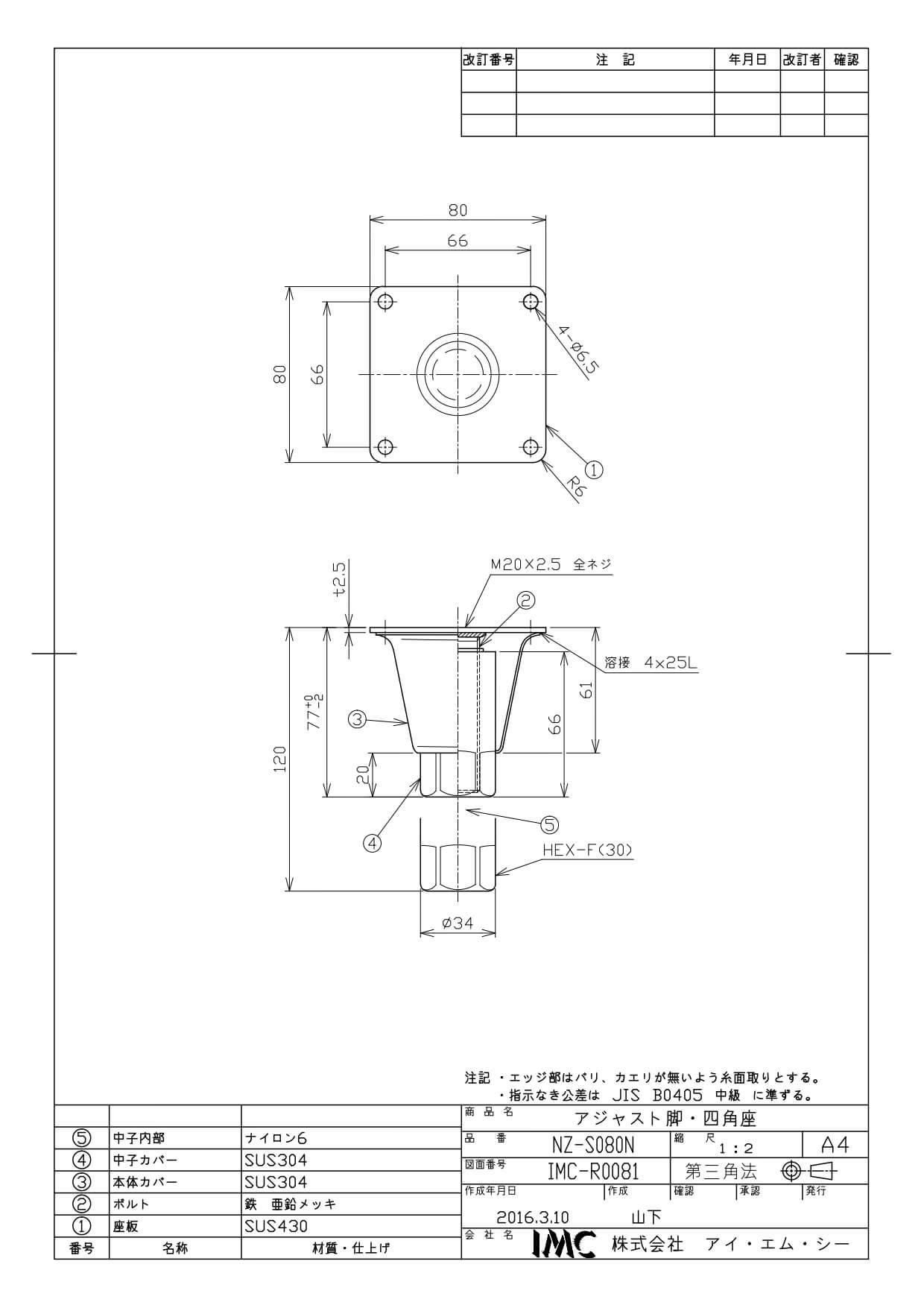 NZ-S080N 新型キャビネット脚80mm 四角座板