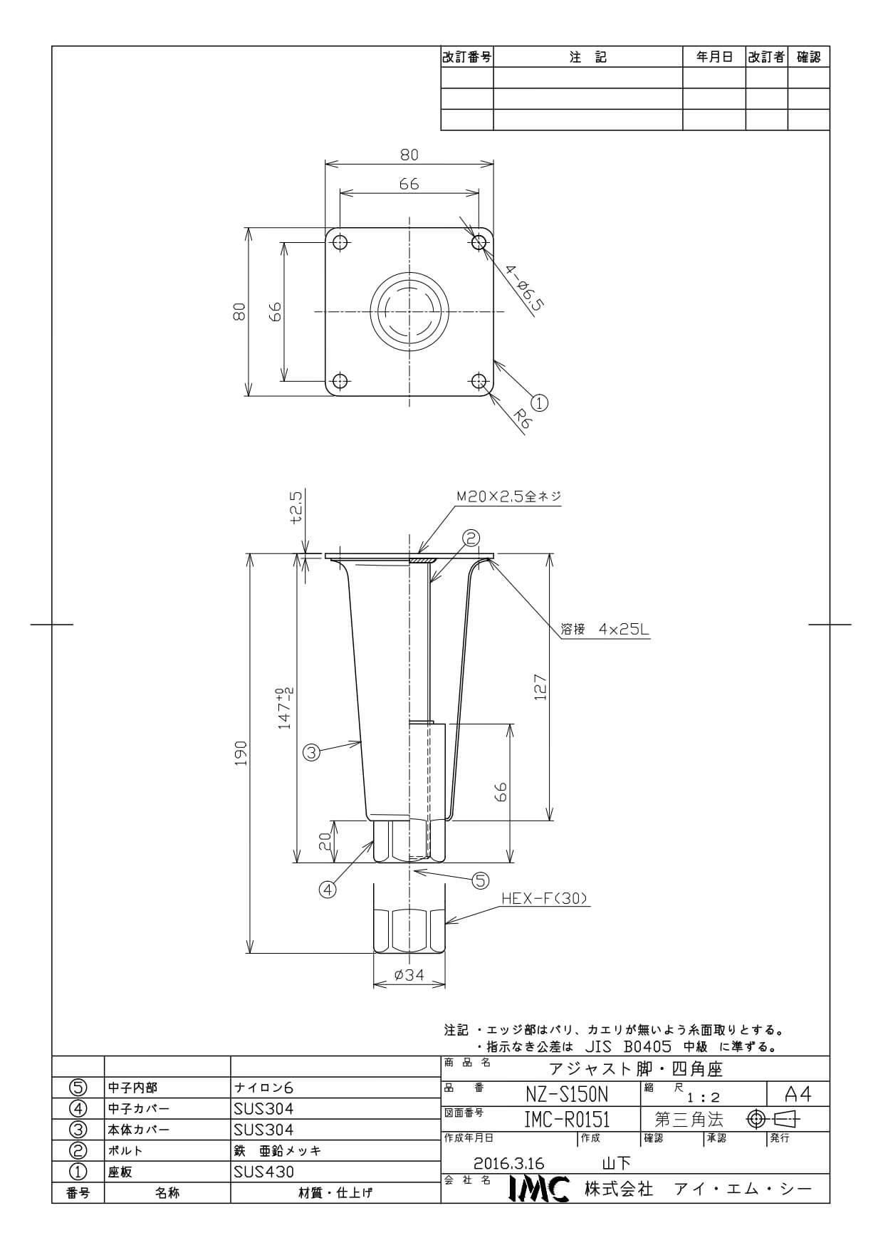 商品名:NZ-S150N 新型キャビネット脚 150mm 四角座板