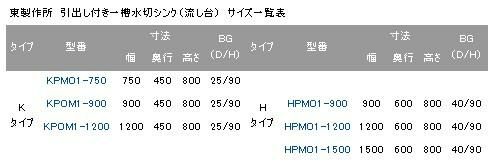 HPOM1-900,HPOMC1-900【東製作所】 引出付一槽水切シンク 幅900×奥行600×高さ800mm