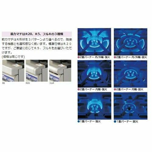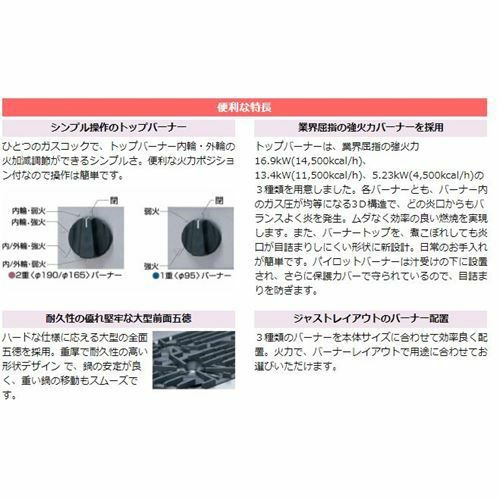 | ジャストレイアウトのバーナー配置 | 3種類のバーナーを本体サイズに合わせて効率良く配置。火力で、バーナーレイアウトで用途に合わせてお選びいただけます。 | |||
