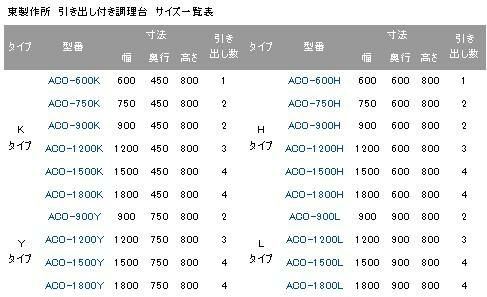 ACO-1800L【東製作所】 引き出し付き調理台 幅1800×奥行900×高さ800mm