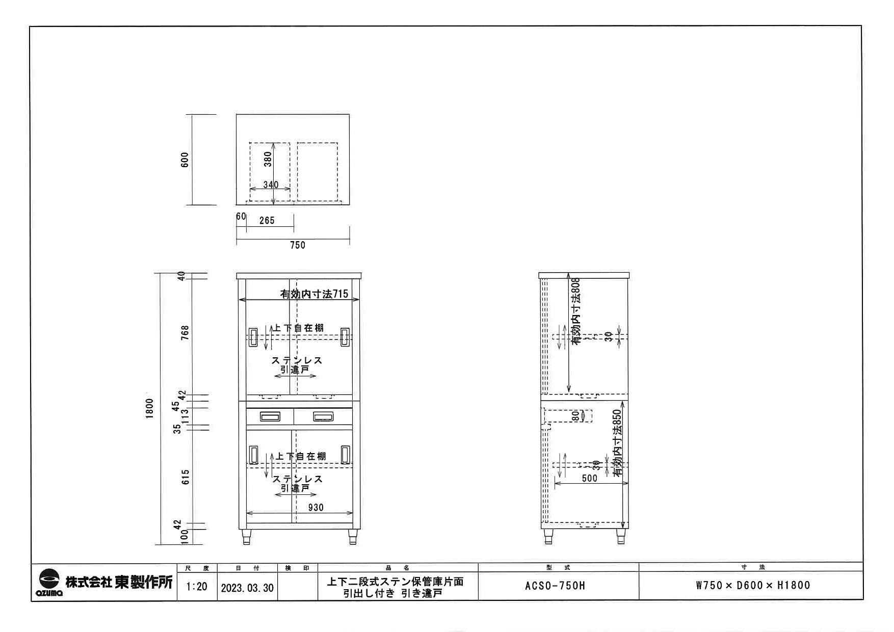 ACSO-750H【東製作所】食器棚 引出付 引出2