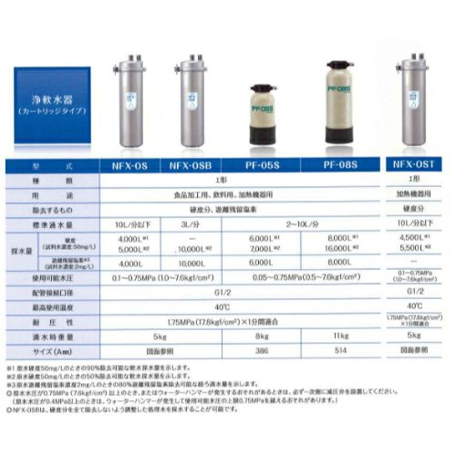 | 採水量 | 硬度 (試料水濃度:50mg/L) | 4,000L ※1 5,000L ※2 | - 10,000L ※2 | 6,000L ※1 7,000L ※2 | 8,000L ※1 16,000L ※2 | 4,500L ※1 5,500L ※2 |