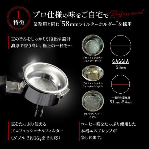 付属品:・プロフェッショナルフィルターホルダー ・プロフェッショナルフィルターシングル ・プロフェッショナルフィルターダブル ・クレマフィルターダブル ・パーフェクトクレマデバイス ・粉計量スプーン ・ブラインドフィルター ・プラスチックタンパー