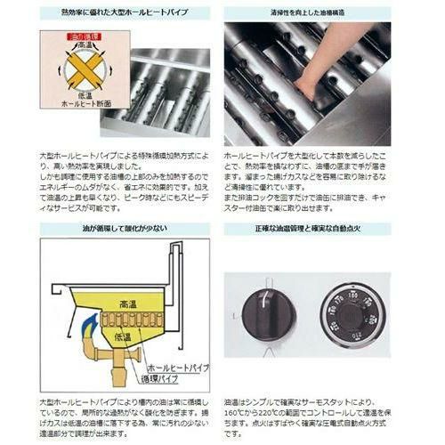 | 大型ホールヒートパイプにより槽内の油は常に循環しているので、局所的な過熱がなく酸化を防ぎます。揚げカスは低温の油槽に落下する為、常に汚れの少ない適温部分で調理が出来ます。 | 油温はシンプルで確実なサーモスタットにより、160℃から220℃の範囲でコントロールして適温を保ちます。点火はすばやく確実な圧電式自動点火方式です。 | |