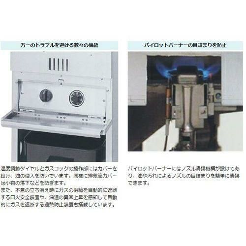 | 温度調節ダイヤルとガスコックの操作部にはカバーを設け、油の侵入を防いでいます。同様に排気筒カバーは小物の落下などを防ぎます。 また、不意の立ち消え時にガスの供給を自動的に遮断する口火安全装置や、油温の異常上昇を感知して自動的にガスを遮断する過熱防止装置も搭載しています。 | パイロットバーナーにはノズル清掃機構が設けてあり、油や汚れによるノズルの目詰まりを簡単に清掃できます。 | |