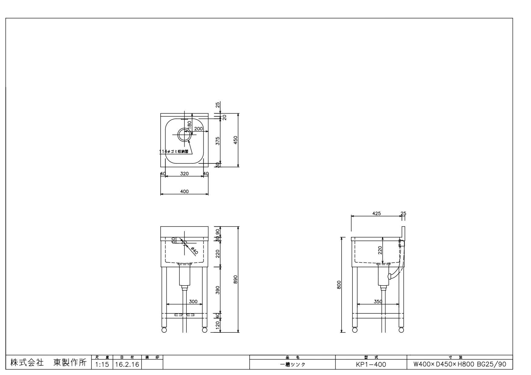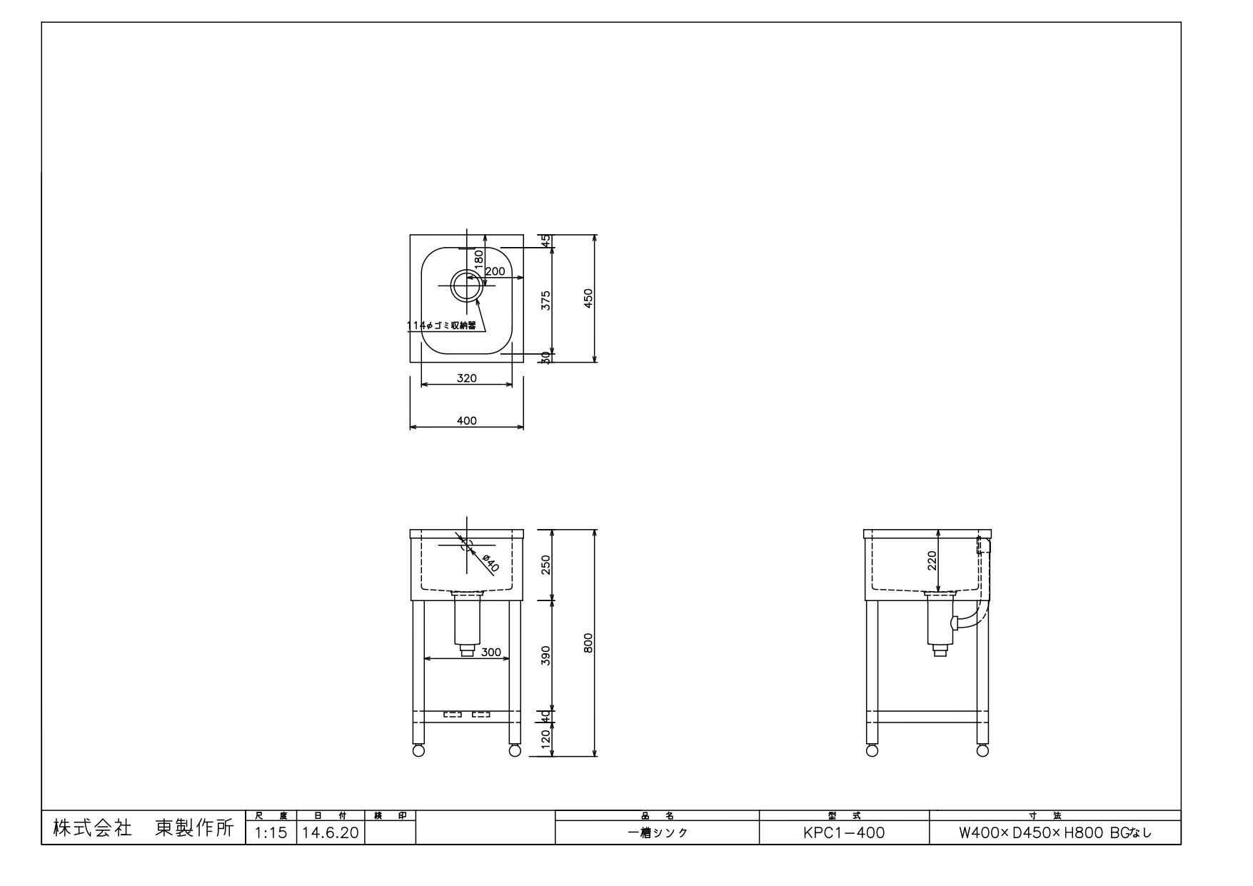 商品名:一槽シンク KP1-400