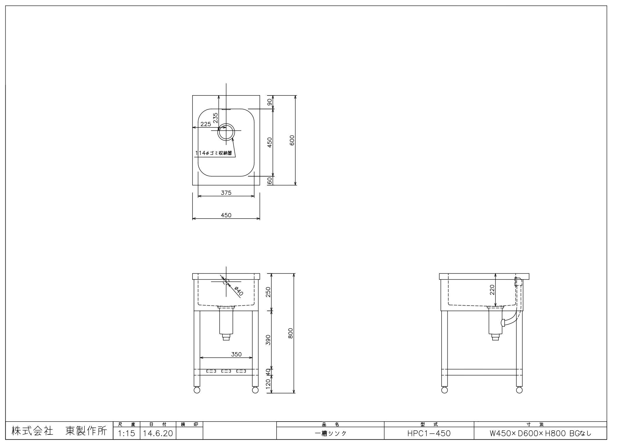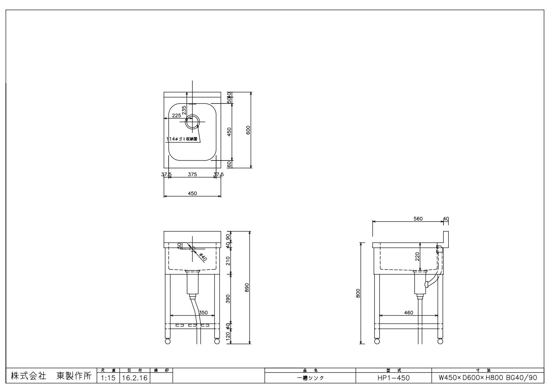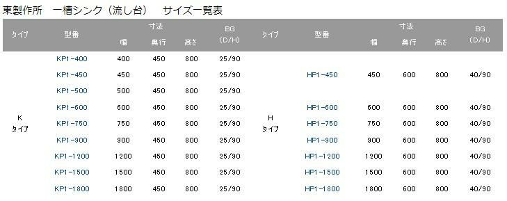 【東製作所】【組立式】一槽シンク HP1-450,HPC1-450