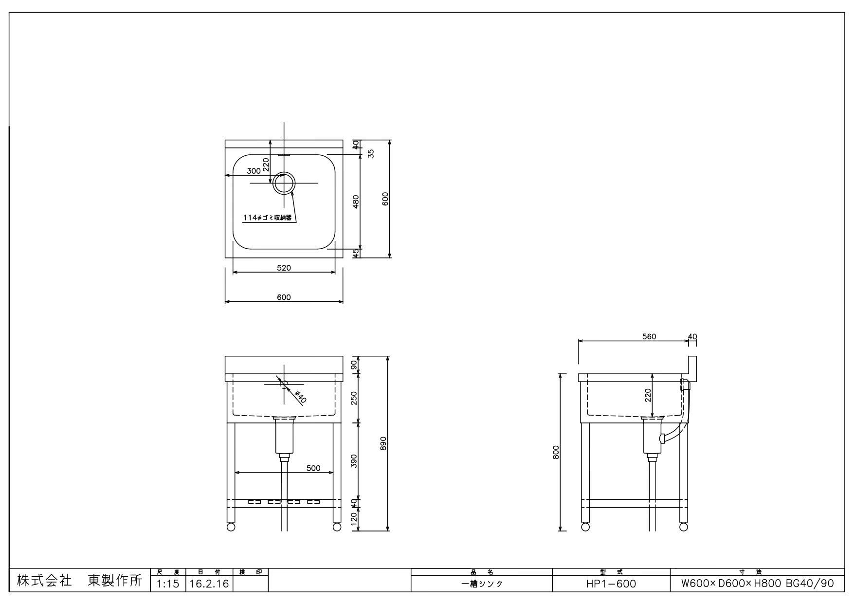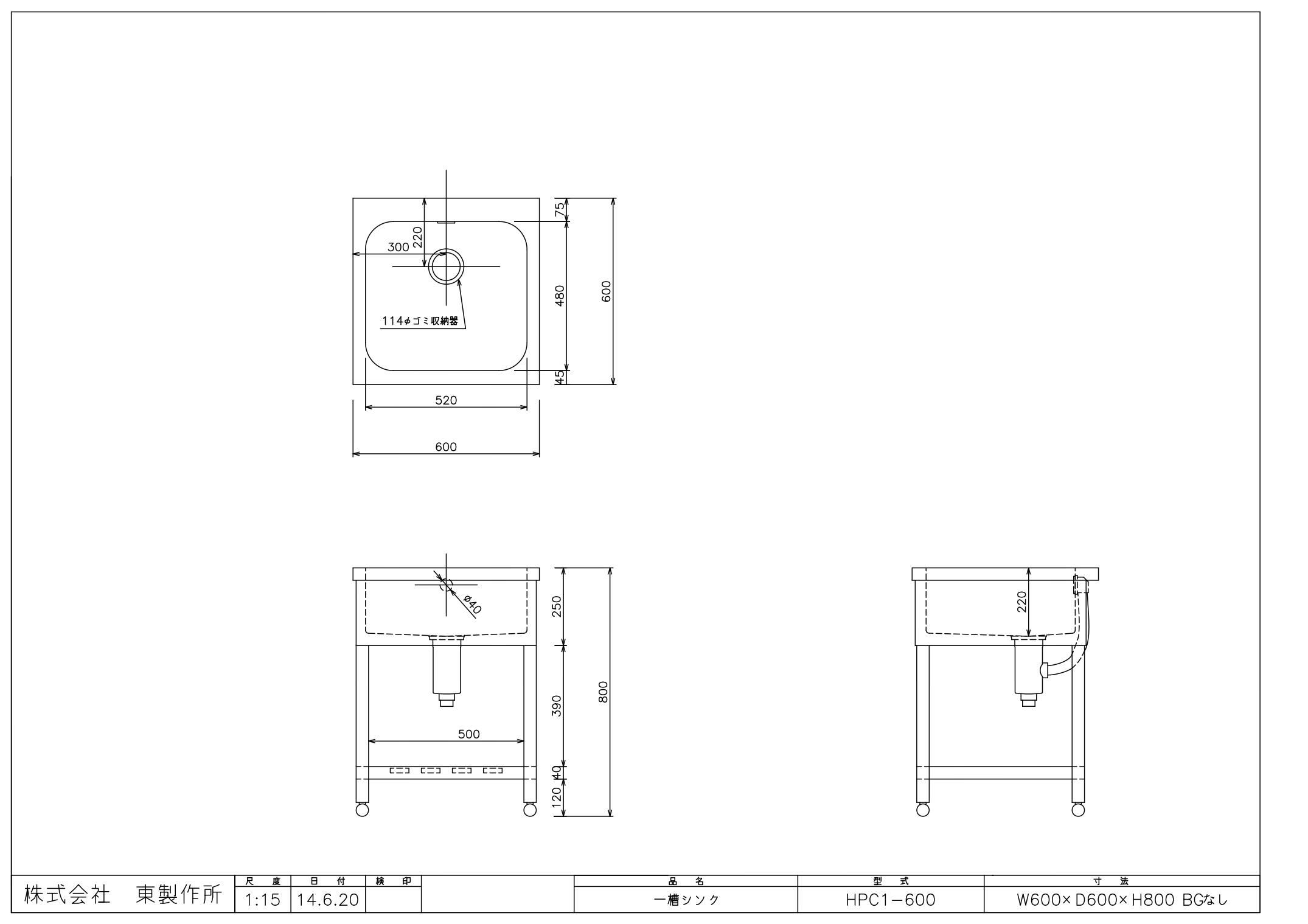 商品名:一槽シンク HP1-600