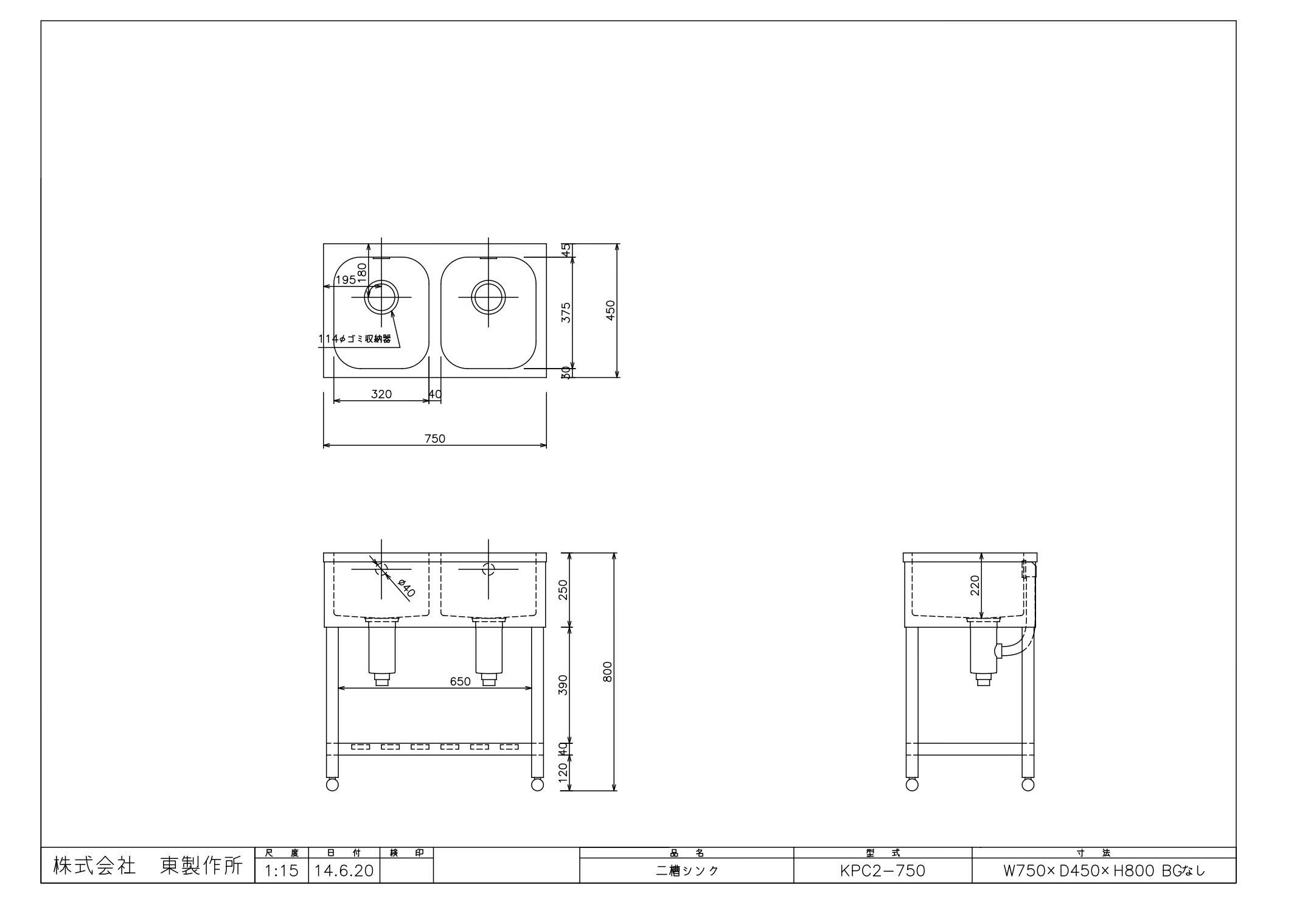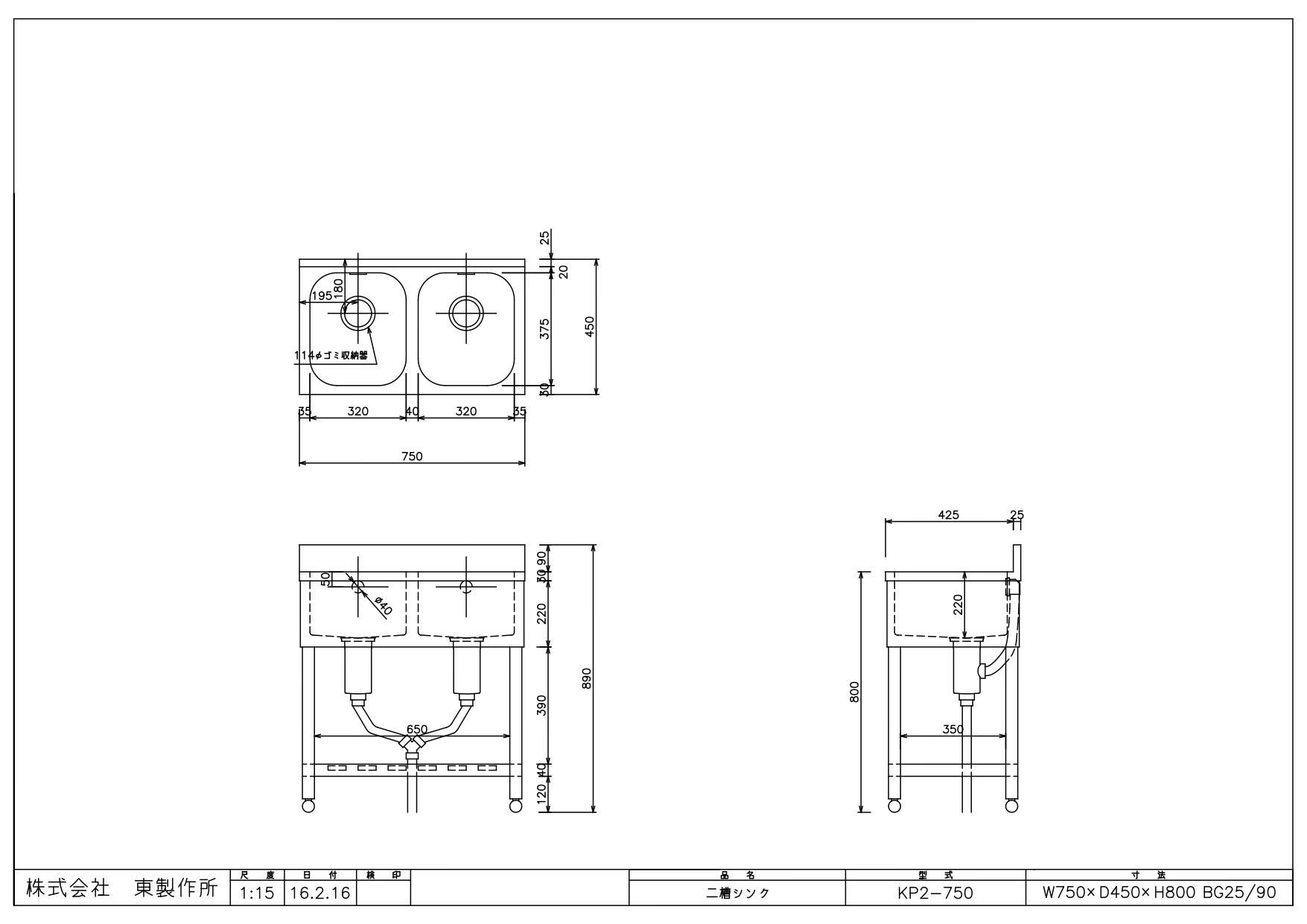 商品名:二槽シンク KP2-750