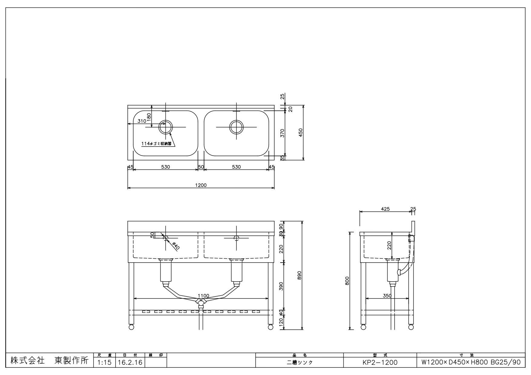商品名:二槽シンク KP2-1200