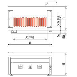 | ■ 商品について ■ | ■電気式焼物器ヒゴグリラー「焼鳥大串タイプ」■ 火床の奥行寸法を多様化。オリジナルな大串料理に対応!! 個性的なオリジナルの料理が注目される時代背景に即して、串焼き料理も多様化してきています。そのニーズに対応して、火床の奥行寸法を広げました。 「焼鳥大串タイプ」は150mm、170mm、200mmと従来の焼鳥専用タイプより、奥行のあるサイズを取り揃えています。 オリジナルな大串料理は、焼鳥料理の魅力をさらに広げて集客力、また繁盛力のアップに役立ちます。 ■焼鳥大串タイプ・床置型■