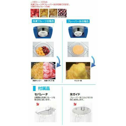 付属品(各1個):氷旗、予備刃物、上下ハンドル、上下ハンドル取付ネジ、排水ホース、シャフトカバー、カートリッジ、ローター大(冷凍フルーツ用)、ローター小(フレーバー氷用)、氷ガイド、セパレーター、バット、取扱説明書