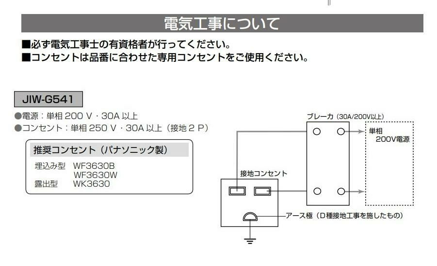 コンセント:単相 250V・30A以上(接地 2P)