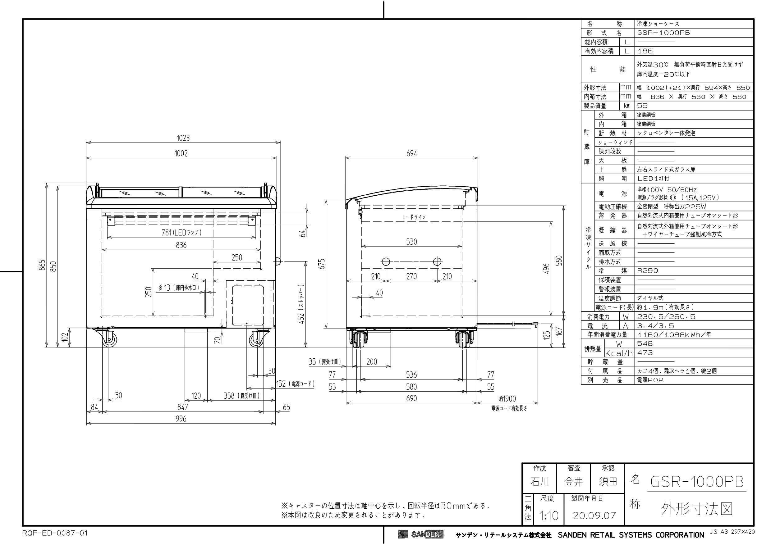 GSR-1000PB 【サンデン】冷凍ショーケース 186L 幅1002+21×奥行694×高さ850mm 単相 100V