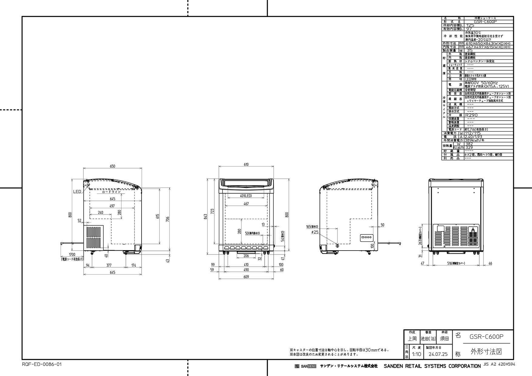GSR-600NPB【サンデン】冷凍ショーケース 103L 幅624×奥行705×高さ850mm 単相 100V