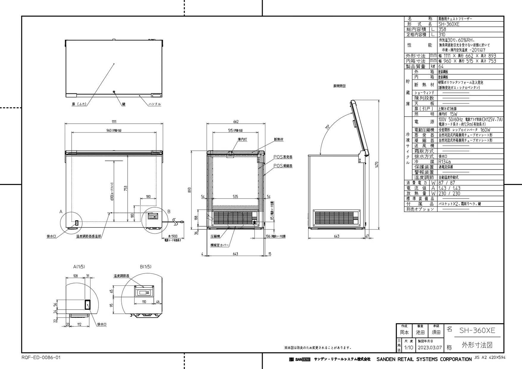 SH-360XE サンデン 冷凍ストッカー チェストタイプ(上開きタイプ) 310L 幅1111×奥行662×高さ893mm
